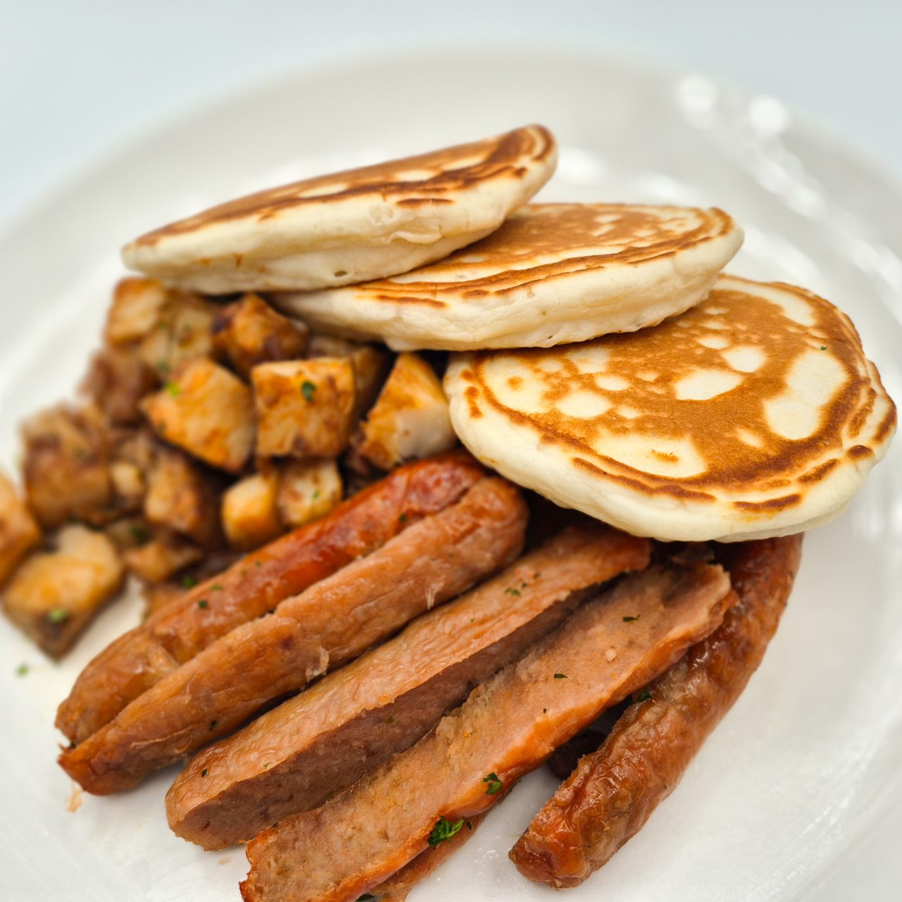 Start your morning right with our Pancakes, Sausage, and Hash Browns breakfast. These fluffy, home-style pancakes are served alongside savoury breakfast sausages and golden-baked hash browns.