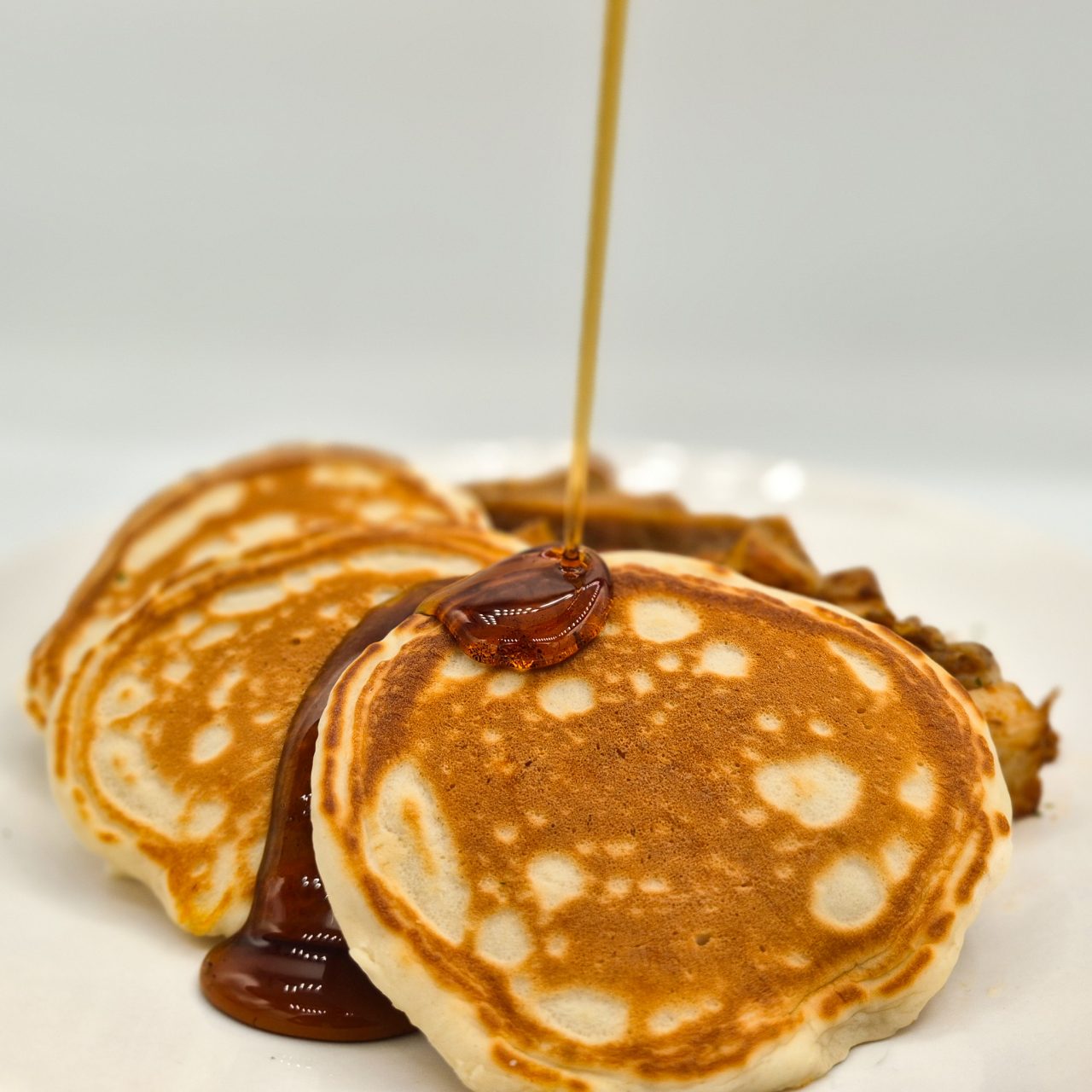 Accompanying the pancakes are savoury breakfast sausages, grilled to perfection for a delicious burst of flavour in every bite. Made with high-quality ingredients and seasoned to perfection, these sausages add a savoury complement to the sweetness of the pancakes.